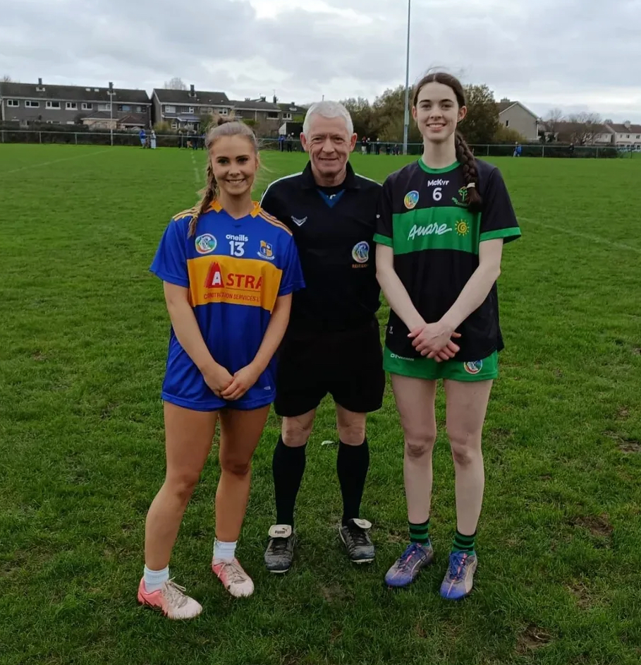 The team captains with the referee before the County Minor B Camogie Semi Final