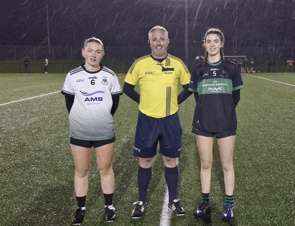 Captains with the referee before the Cork Credit Unions LGFA Minor B County Championship Final at Bishopstown