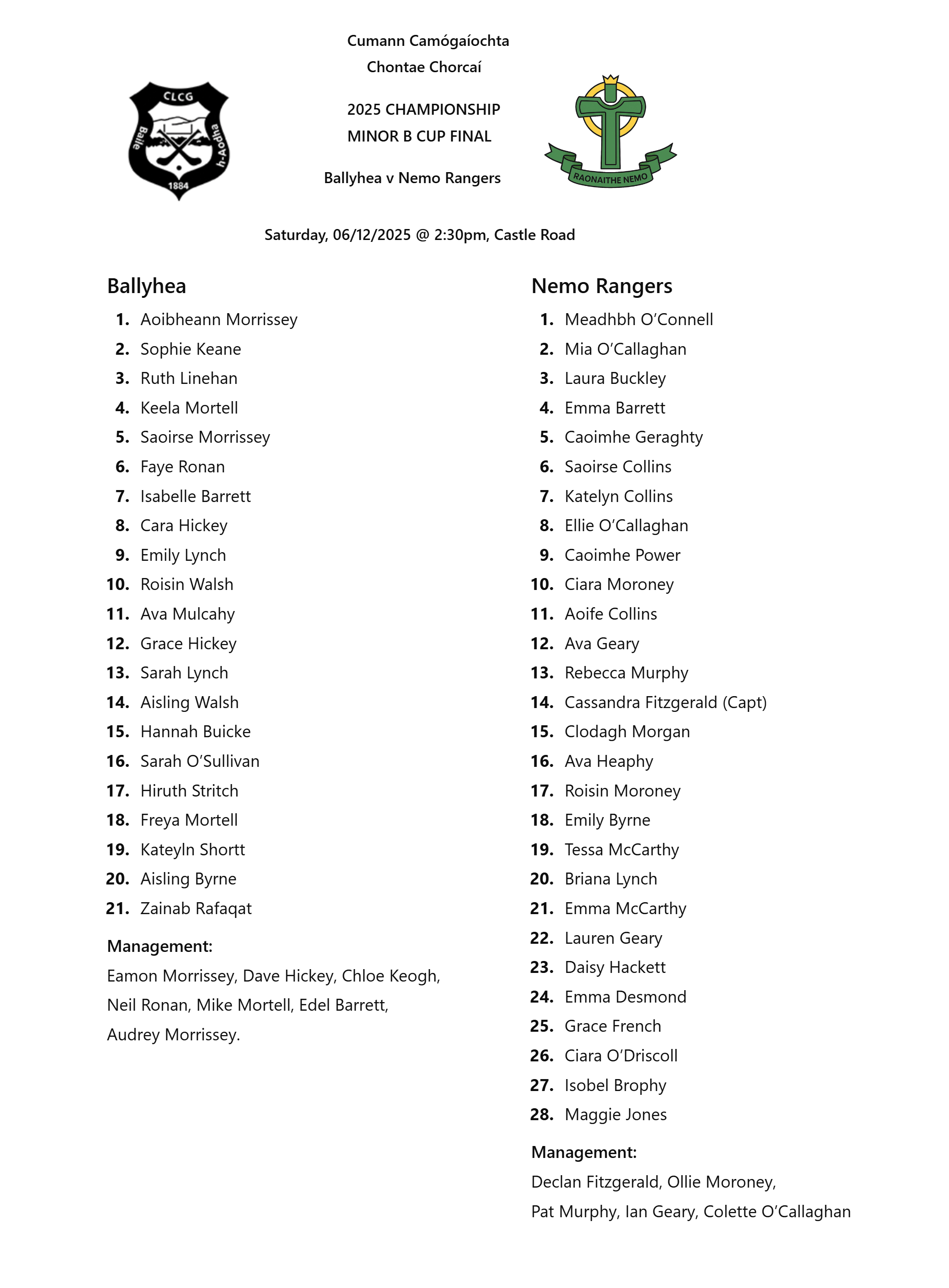 Ballyhea threw caution to the wind and got a late goal but the Nemo defence was outstanding with the Collins sisters and Laura Buckley dominant, with Ellie O’ Callaghan and Cassandra Fitzgerald working back to help out and Emma Barett also dominating.